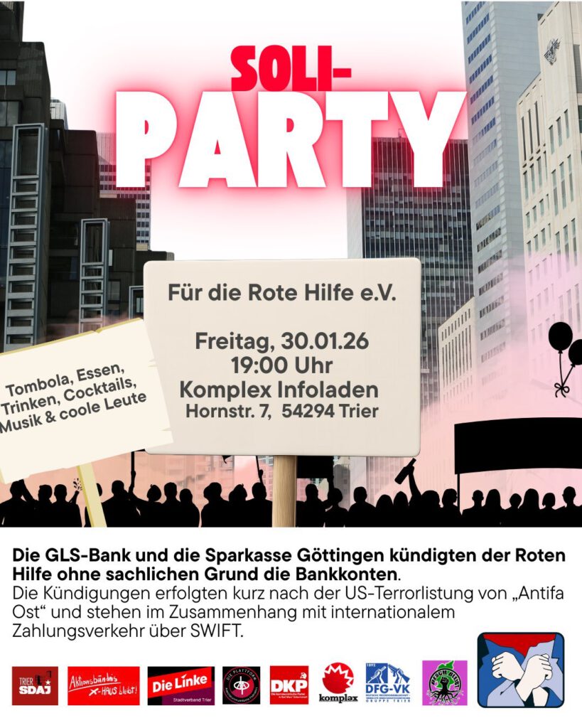 Auch diesen Schlag wehren wir gemeinsam ab und finden neue Wege. Kommt deshalb gerne zur Soliparty am 30.1. ab 19 Uhr im Komplex - Infoladen Trier. Denn wir als Rote Hilfe sind immer an Eurer Seite.