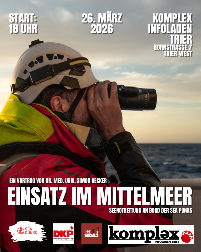 📣 Gründungstreffen Eltern gegen Wehrpflicht Trier „Kein Land für Niemanden“ im Agenda Kino des Broadway Filmtheater Trier! Zum Film: Deutschland steht an einem historischen Wendepunkt: Erstmals seit 1945 wird im Jahr 2025 ein migrationspolitischer Entschließungsantrag im Bundestag angenommen – mit Unterstützung der AfD, die vom Verfassungsschutz wegen rechtsextremer Bestrebungen beobachtet wird. Die Erklärung zur Begrenzung der Zuwanderung sieht unter anderem eine vollständige Schließung der deutschen Grenzen vor. Ein Paradigmenwechsel kündigt sich an: weg vom Schutz von Geflüchteten, hin zu Abschottung und Abschreckung. KEIN LAND FÜR NIEMAND – ABSCHOTTUNG EINES EINWANDERUNGSLANDES begibt sich auf die Suche nach den Ursachen dieser politischen Zäsur und nimmt die Zuschauer*innen mit auf eine aufrüttelnde Reise. Die Dokumentation beginnt an den europäischen Außengrenzen, wo eine andauernde humanitäre Katastrophe auf staatliche Ignoranz trifft, aber auch auf ziviles Engagement. Sie begleitet einen Rettungseinsatz auf dem Mittelmeer, dokumentiert die katastrophale Lage aus der Luft und erzählt die Geschichten von Überlebenden, die trotz Gewalt und tödlicher Risiken den Weg nach Deutschland gefunden haben. Während Deutschland dazu beiträgt, eine europäische Festung zu errichten, gerät die politische Landschaft ins Wanken. Von emotionalisierten Medienberichten bis zu hilflos nach rechts rudernden Politikerinnen zeichnet sich eine gesellschaftliche Erzählung ab, die sich gegen Migrantinnen und Schutzsuchende richtet. Ist Migration überhaupt das große Problem, zu dem es gemacht wird? Oder offenbart die Abschottungspolitik tiefere gesellschaftliche Ängste? In eindringlichen Geschichten zeigt der Film eine zunehmend beängstigende Realität aus Sicht von Geflüchteten und analysiert die Dynamiken hinter dem historischen Rechtsruck. Im Dialog mit Aktivistinnen, Wissenschaftlerinnen und Publizist*innen fordert KEIN LAND FÜR NIEMAND – ABSCHOTTUNG EINES EINWANDERUNGSLANDES dazu auf, den brutalen Status quo und die scheinbar unaufhaltsame Radikalisierung der Migrations- und Asyldebatte in Frage zu stellen. Denn damit es auch in Zukunft bei einem glaubhaften „Nie wieder“ bleibt, brauchen wir Alternativen – Alternativen, die der unvermeidbaren Realität von Migration in einer krisenhaften Welt und einem Einwanderungsland im Umbruch gerecht werden. Der Komplex Infoladen Trier steht Hauptpate für den Film „Kein Land für Niemanden“, der im Rahmen des Agenda Kinos des Broadway Filmtheaters gezeigt wird. Kooperationspartner sind Amnesty International Trier, Buntes Trier und das OAT Trier. Der Film wird am 19.03.26 um 19:30 Uhr im Broadway Filmtheater gezeigt. Im Anschluss an den Film gibt es die Möglichkeit des Expertengesprächs mit Dr. med. univ. Simon Becker, der im letzten Jahr als Arzt auf einer Rettungsmission an Bord der SeaPunks war.